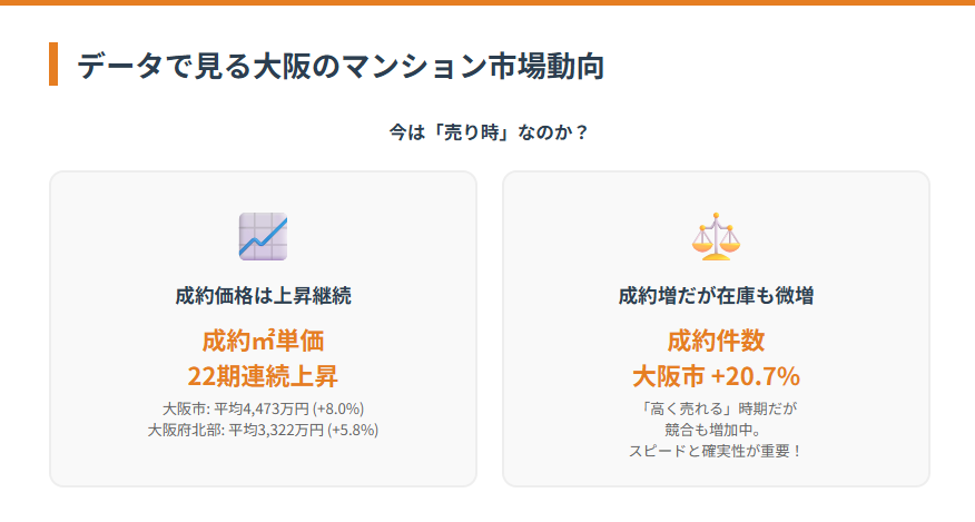 - 大阪市:平均成約価格 4,473万円(前年比 +8.0%)