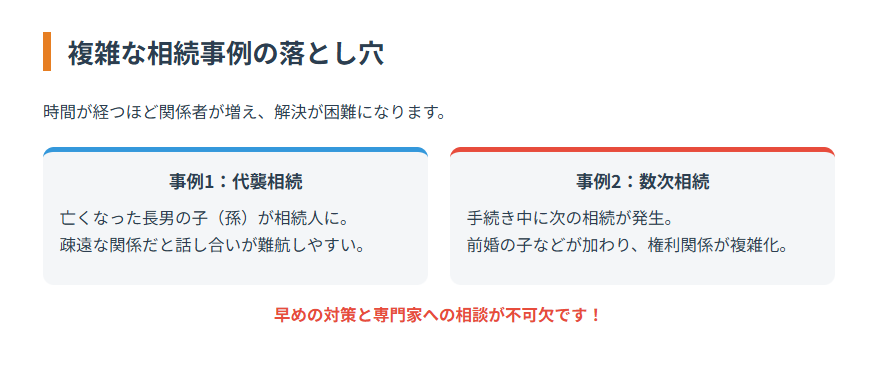 登記手続きも複雑化し、専門家の介入なしには解決が難しくなります。