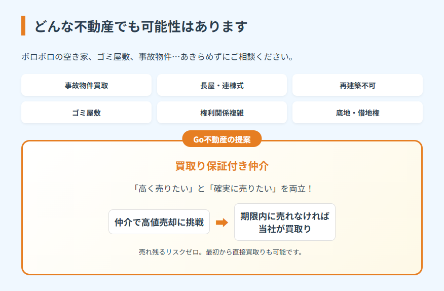 一般的な不動産会社では「取り扱いが難しい」と断られてしまうような物件でも、株式会社Go不動産は真正面から向き合います。