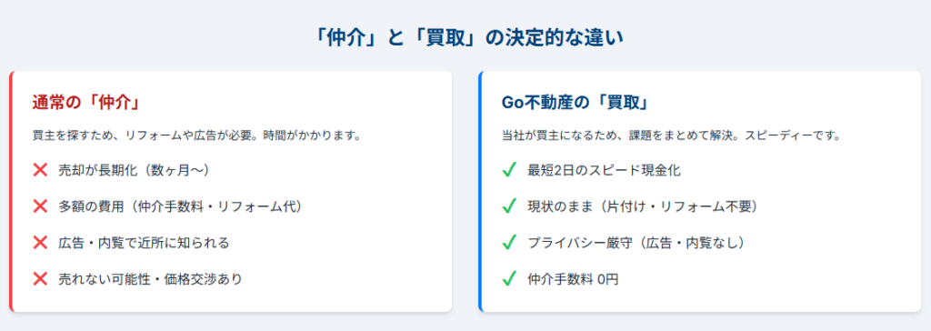 Go不動産は「仲介」ではなく、【当社がお客様から直接買い取る】という「不動産買取」を専門としています。