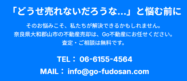奈良県・大和郡山市周辺のエリアで、ご相続された物件や、管理にお困りの空き家、あるいは様々な事情で売却が難しい不動産のことでお悩みなら、ぜひ一度Go不動産の無料相談・無料出張訪問査定をご活用ください。
