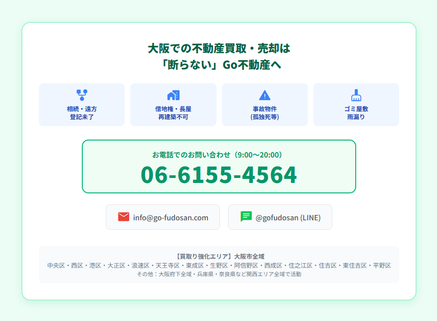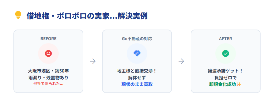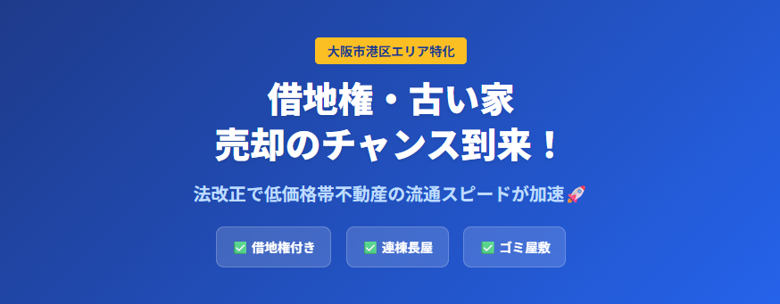 私たち株式会社Go不動産は、大阪府下全域、特に大阪市港区をはじめとする湾岸・市内南部エリアにおいて、他社では断られがちな「訳あり物件」の解決に力を入れている不動産会社です。 今回は、実際にあった借地権付き建物のご相談事例と、2024年の法改正によって変わりつつある低価格帯不動産の売却事情について、私たちが提供するサービスとあわせて詳しくご紹介します。