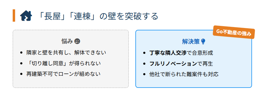 「長屋」「連棟」の売却・買取りにおける壁を突破する