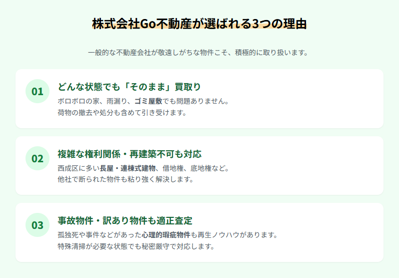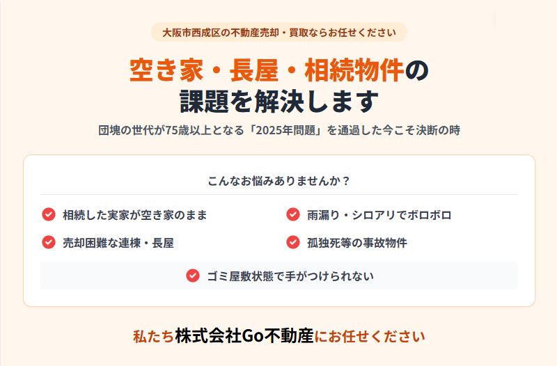 私たち株式会社Go不動産は、こうした「訳あり物件」や「処分に困っている不動産」の買取りを専門としています。