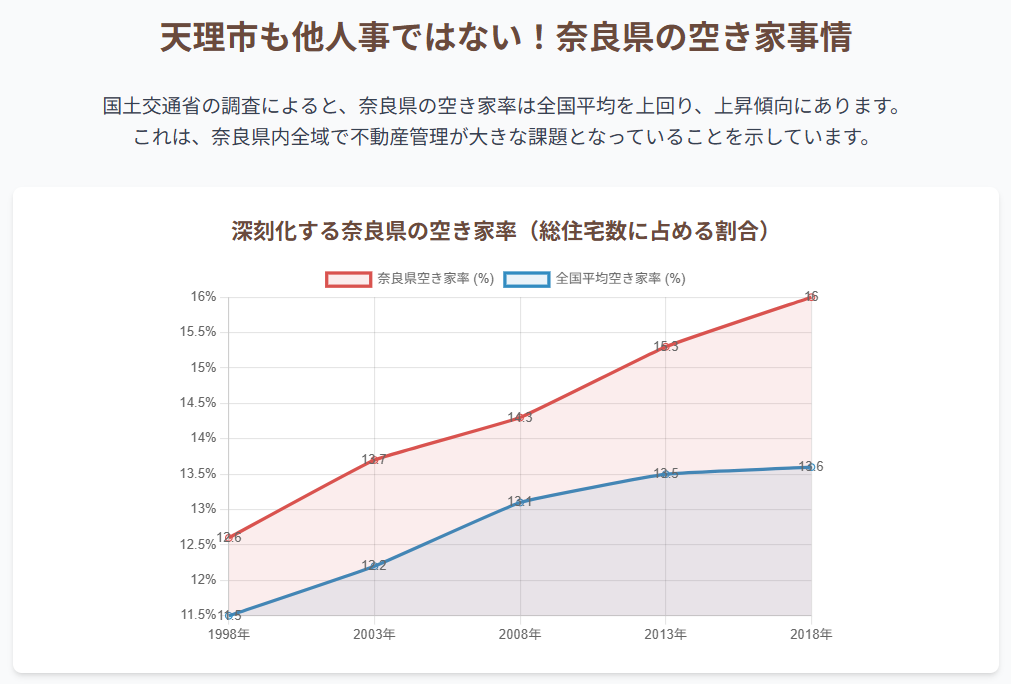 天理市の公式な空き家率データは限定的ですが、市の著しい人口減少を鑑みれば、県平均と同様かそれ以上に厳しい状況にあると推測するのが自然です。
