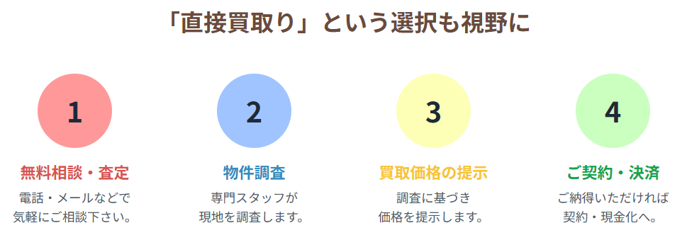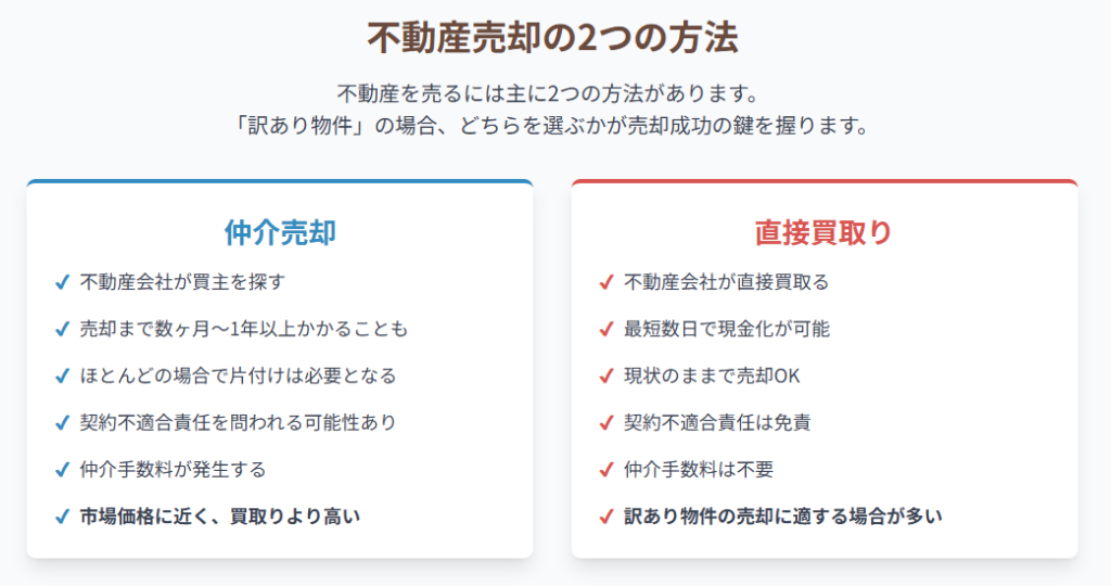 | 最適な物件 | 空き家、再建築不可、相続物件、 ゴミ屋敷、孤独死・自殺物件など 早期現金化したい訳あり物件  | 築浅、好立地など、 買い手がつきやすい問題のない物件  |
