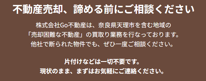 株式会社Go不動産は、奈良県内、特に生駒市、奈良市、香芝市、天理市などをはじめとするエリアで、売却が困難な不動産の問題解決に特化した専門家です。