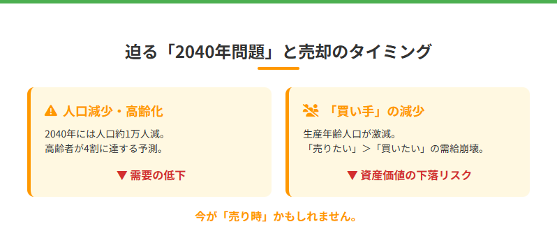 つまり、「売りたい人」が溢れかえり、「買いたい人」がいなくなる需給バランスの崩壊が、2040年に向けて加速していくのです。