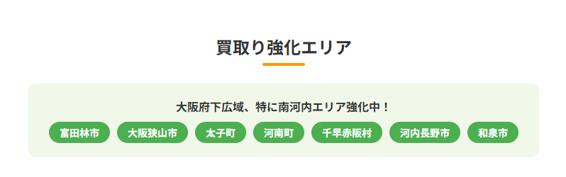 【買取り強化エリア】 富田林市、大阪狭山市、太子町、河南町、千早赤阪村、河内長野市、和泉市