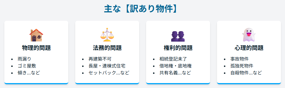 E様の事例のような「雨漏り」「シロアリ被害」「ボロボロの家」のほか、荷物が撤去されていない「ゴミ屋敷」状態、建物の「傾き」がある物件。 - 法的な問題を抱える物件