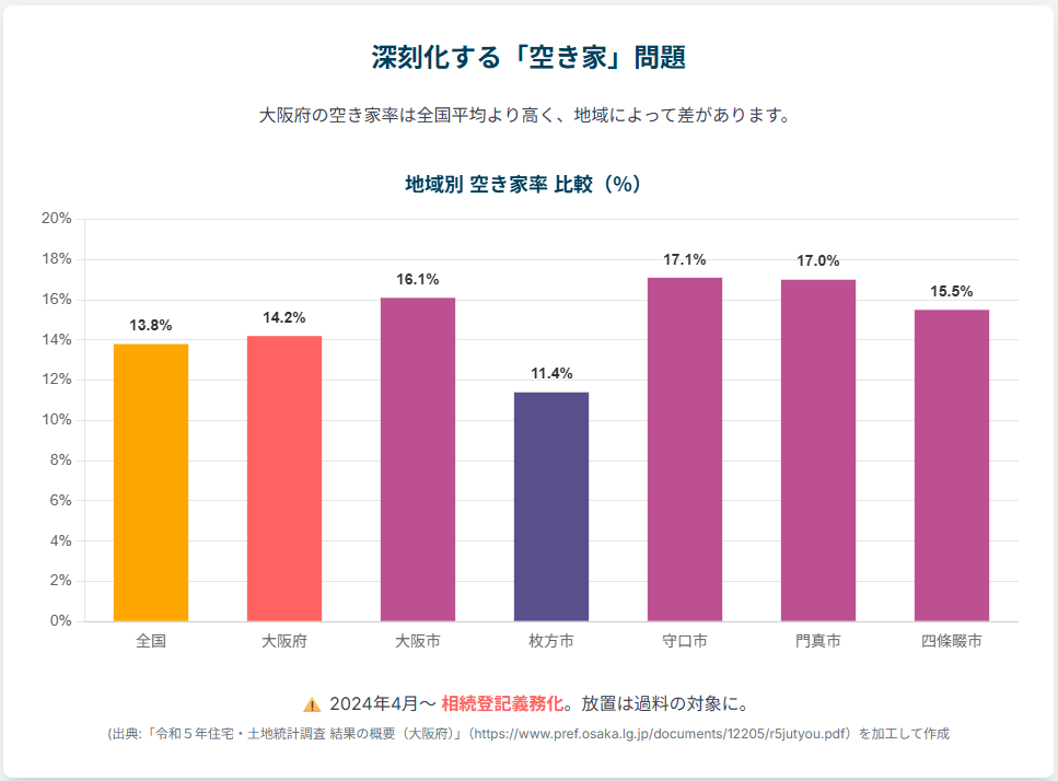 - 深刻な空き家:大阪府の空き家率は14.2%と全国平均を上回り、その数は約70万戸にのぼります。