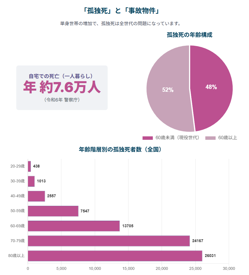 - 孤独死・ゴミ屋敷:誰にも看取られず自宅で亡くなる「孤独死」は、65歳以上だけで全国で年間5万8,044人に達します。