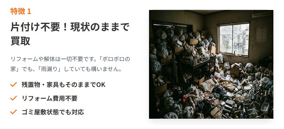 生活ゴミや衣類・寝具などが散乱し、家財道具が一式残ったままの「残置物の多い家」や「ゴミ屋敷」、雨漏りしている状態・シロアリの被害にあっている状態でも「現状有姿」で買い取ります。
