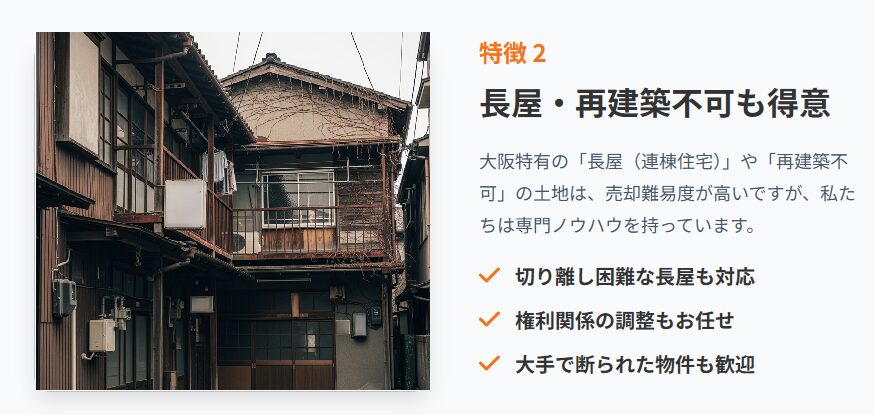 再建築不可の物件や長屋売却を大阪で検討されている方は、専門ノウハウを持つ私たちにご相談ください。