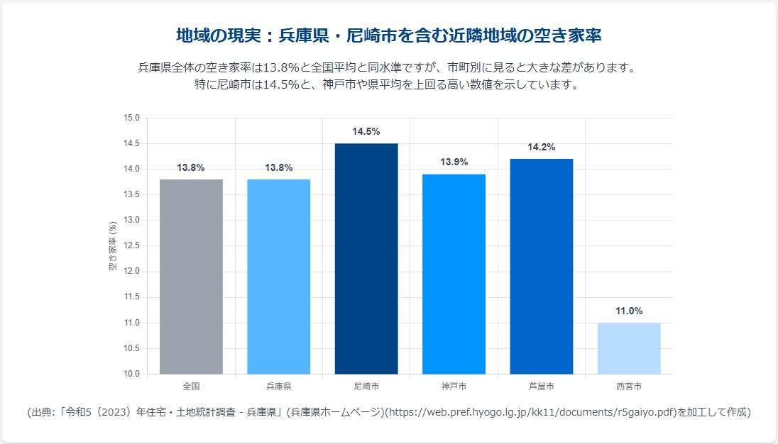 驚くべきことに、尼崎市の空き家率14.5%は、神戸市や兵庫県全体の平均を上回る数値です。