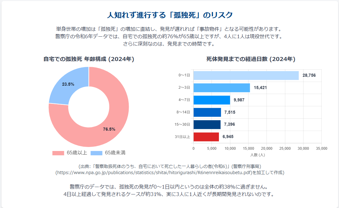 警察庁の統計(令和6年)では、自宅において死亡した一人暮らしの者(孤独死・孤立死)は年間76,020人に上り、そのうち約76%(58,044人)が65歳以上でした。