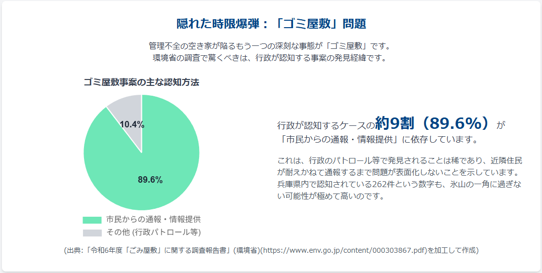 同調査で、ごみ屋敷事案の主な認知方法は「市民からの通報・情報提供」が89.6%と約9割に達しています。