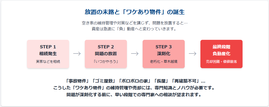 最終的に資産価値を失うだけでなく、倒壊の危険や害虫・害獣の発生源として、近隣トラブルの原因にもなりかねません。