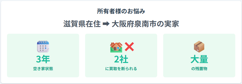 ご両親様が相次いで亡くなられ、泉南市のご実家を相続されたものの、その処分にお困りでした。