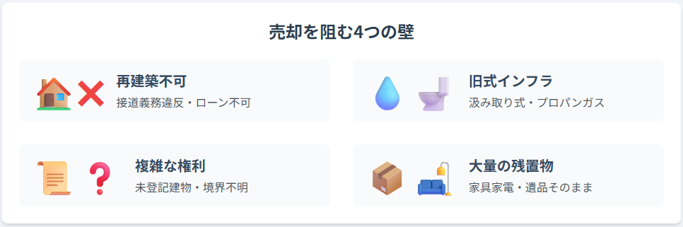 私たちがM様からお預かりすることになったこの物件は、単に「空き家」というだけでなく、一般的な不動産売買を困難にする複数の深刻な課題を抱えていたのです。