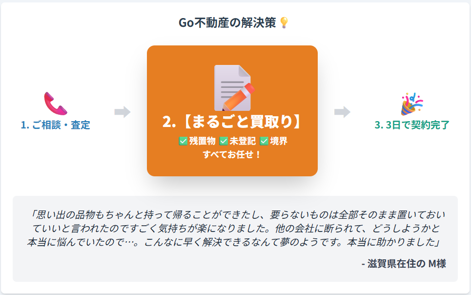 「私たちが【このままの状態で】、【まるごと】買い取らせていただきます。家の中の物で、M様にとって【必要な思い出の品だけお持ち帰りください】。残りは私たちが責任を持って整理・処分いたします。未登記の物置小屋も、境界が不明確な件も、すべて含めて私たちが引き受けますので、ご安心ください」
