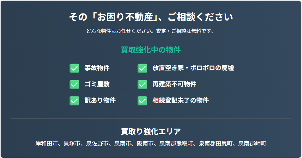 セルフネグレクトの痕跡が残るお家、ゴミ屋敷状態の物件、事件や事故が起きてしまった「訳あり物件」など、どのような状態の不動産でもご相談ください。