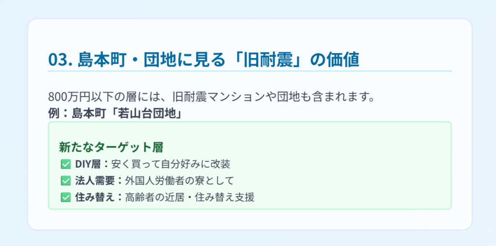 しかし、800万円以下の価格帯であれば、「現金購入」を検討する投資家や、リノベーション前提の実需層(セカンドライフや若年層)がターゲットに入ってきます。