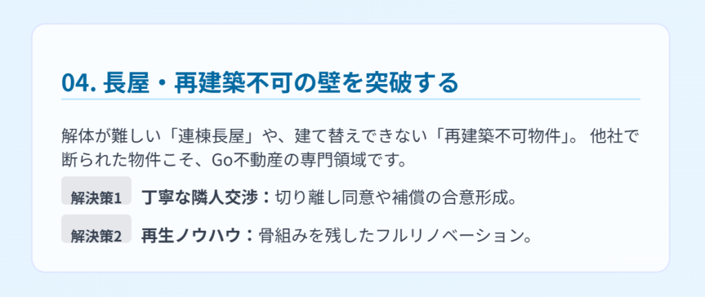 株式会社Go不動産では、こうした「他社で断られた長屋・再建築不可物件」の買取・仲介に特化しています。