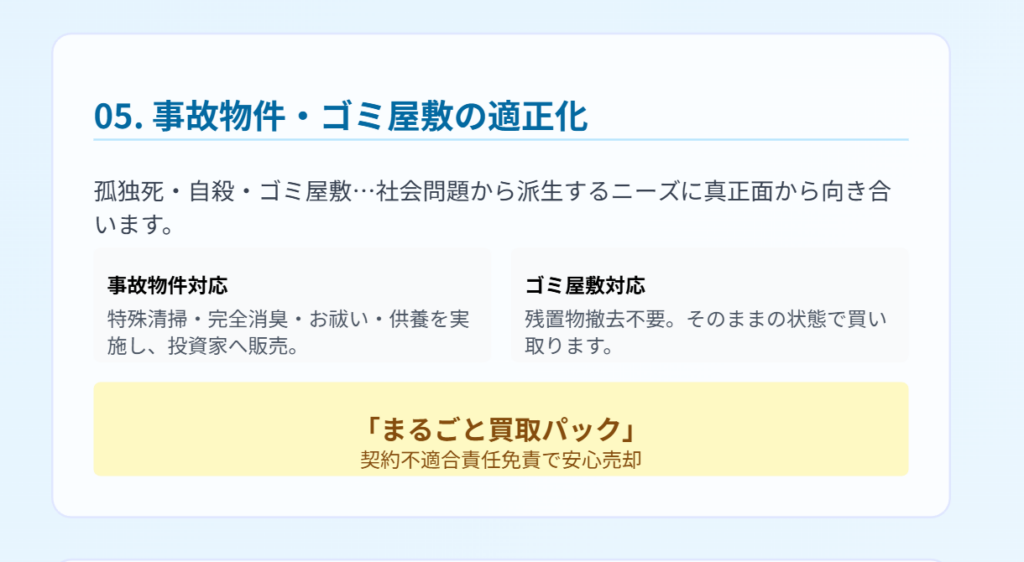 近年急増している「静かな社会問題」とされる孤独死の発生した建物や、過去に自殺のあった物件、セルフネグレクトなどの症状に陥ってしまいゴミ屋敷化してしまった居住中の不動産など、社会問題から派生する水面下のニーズに対し、真正面から向き合います。