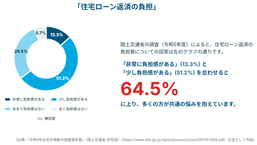 国土交通省の調査(※)では、住宅ローンの返済に「負担感がある」(非常に負担感がある及び少し負担感があるを含む)と回答した割合は、令和5年度で64.5%に上り、(※参考:国土交通省「令和5年度 住宅市場動向調査報告書」)近年の物価高がその不安をさらに増大させている状況が伺えます。