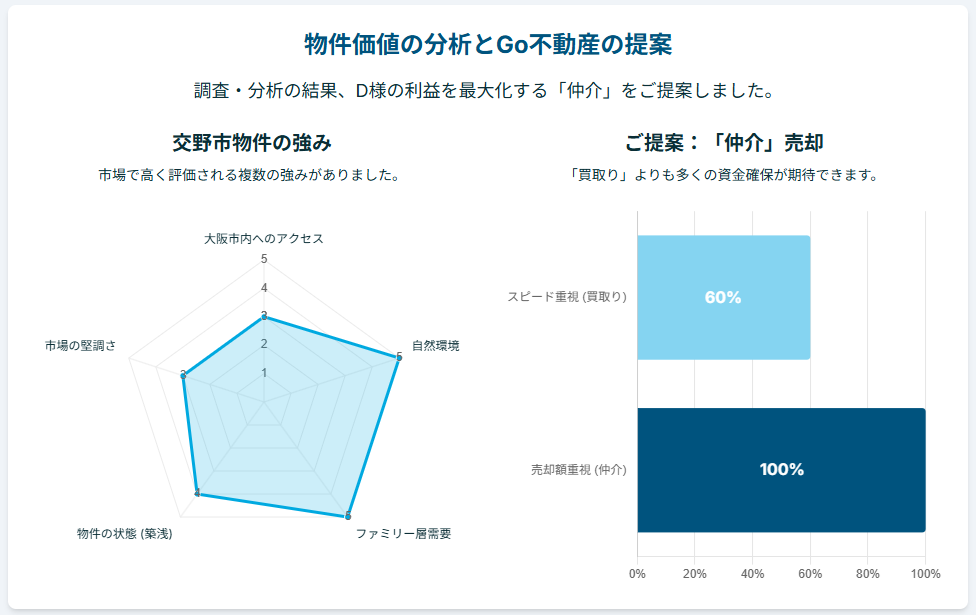 「D様の物件は、現在の交野市の不動産市場において非常に需要の高い条件を備えています。私たちが直接『買取り』する金額よりも、一般の買主様を探す『仲介』で売却活動を行った方が、より高い価格で売却できる可能性が十分にあります。そうなれば、ローン残債を完済できるだけでなく、お引越しや新しい生活を始めるための資金も確保できる見込みが立ちます」