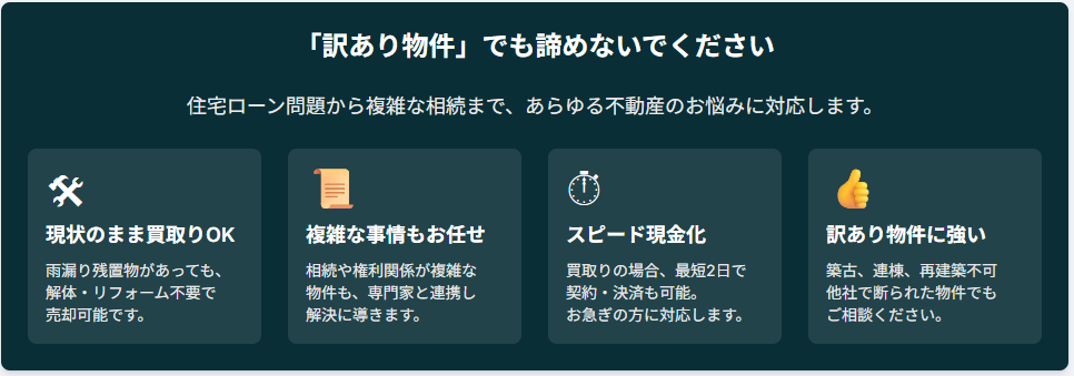 一般的には売却が難しいとされる「築古」「連棟」「長屋」「再建築不可」といった訳あり物件も、独自のノウハウでその価値を見出し、お客様にご納得いただけるご提案をいたします。