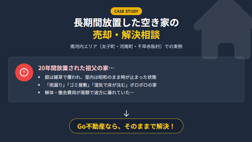大阪府太子町・河南町・千早赤阪村 長期間空家のまま放置していた不動産の売却相談