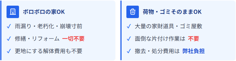 しかし弊社では、修繕や解体に費用をかける必要はありません。建物が老朽化していても、そのままの状態でお引き渡しいただけます。
