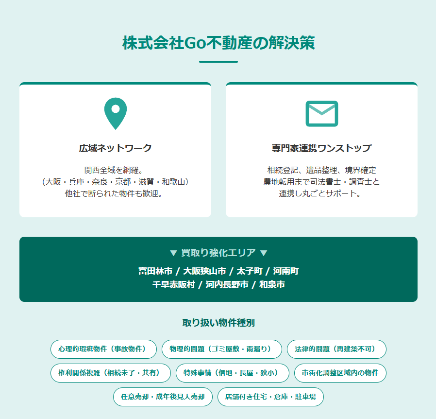 株式会社Go不動産では、大阪府全域、特に現在、南河内エリア(太子町、富田林市、大阪狭山市、河南町、千早赤阪村、河内長野市、和泉市)における不動産の買取りと売却活動を強化しています。