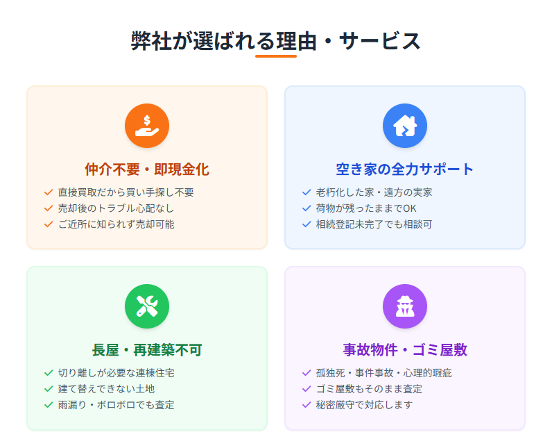 - その他特殊な事情を抱える物件:借地権・底地権、増築未登記の物件、長屋・連棟式住宅、文化住宅、狭小住宅