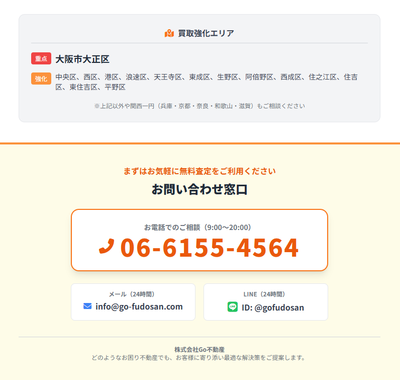 上記エリア以外にお住まいの方や、兵庫・京都・奈良・和歌山・滋賀など関西一円で借地の買取りや売却を検討されている方も、お気軽にお問い合わせください。