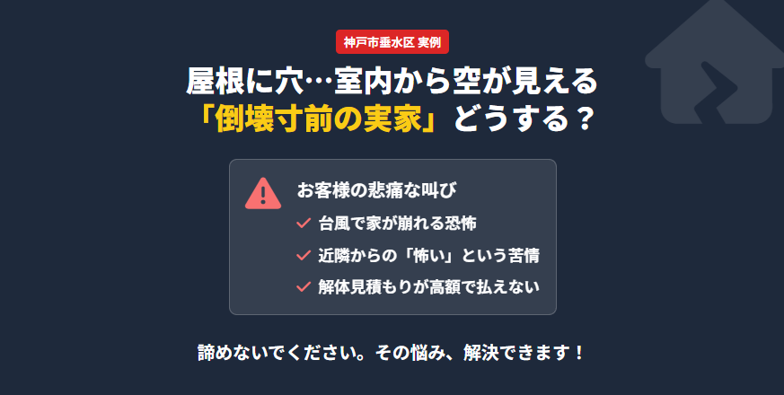 今回は、倒壊の危険があるような老朽化した空き家を抱える神戸・兵庫エリアの皆様へ、私たちが提案できる解決策をお話しします。