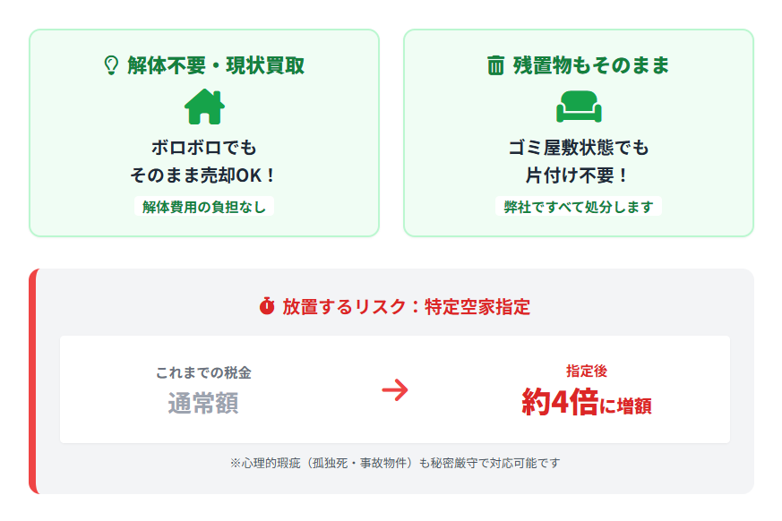 - 解体費用の持ち出し不要(現況有姿で買取)