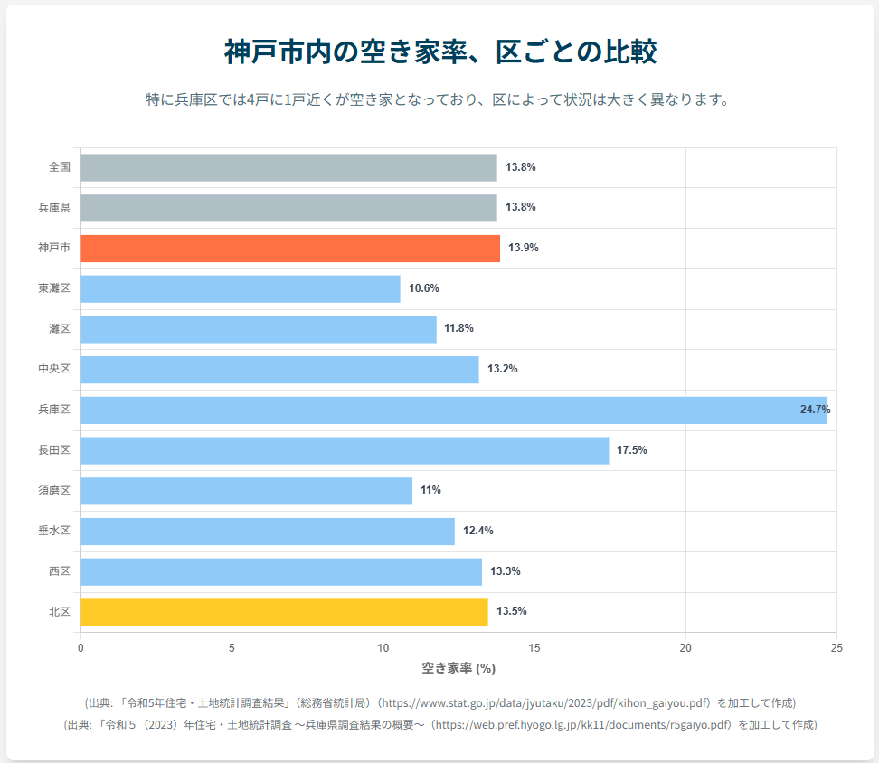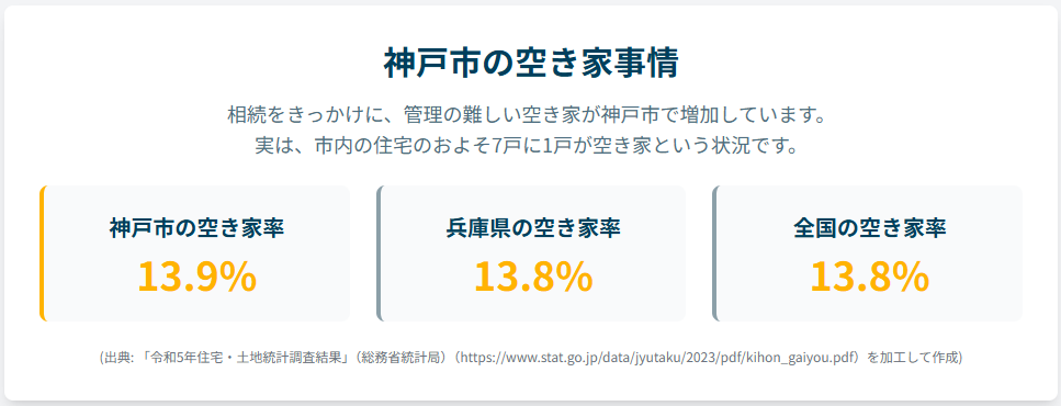 神戸市では人口減少や高齢化を背景に空き家が増加傾向にあり、北区の空き家率は13.5%にのぼります。
