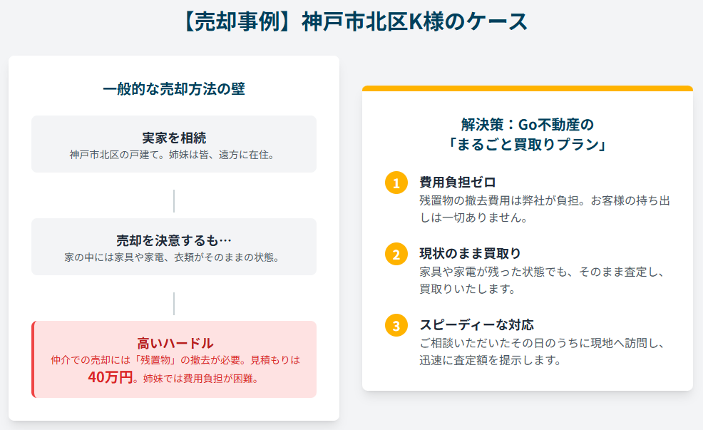 【まるごと買取りプラン】であれば、残置物の撤去費用を弊社が負担するため、K様姉妹が先立って費用をご用意いただく必要は一切ありません。