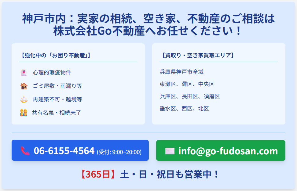 株式会社Go不動産は、神戸市内の相続物件の売却・買取りなどのご相談を承っております。