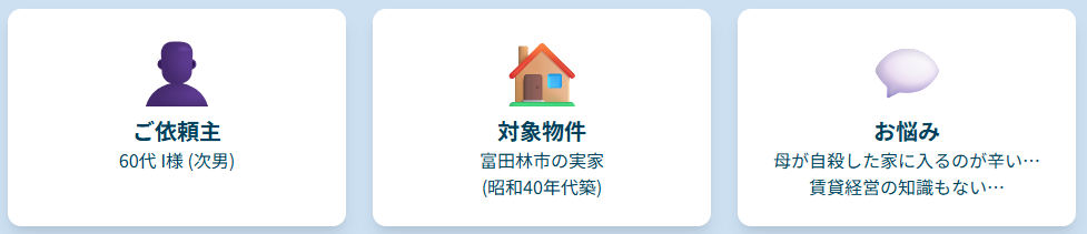 お父様が亡くなられたことで、I様は突然「大家」の立場を引き継ぐことになりました。