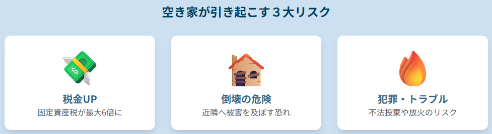 空き家を放置すれば、建物の急速な老朽化や倒壊の危険、不法投棄や放火といった犯罪リスク、さらには固定資産税が最大6倍に跳ね上がる可能性など、所有者には重い責任と経済的負担がのしかかります。
