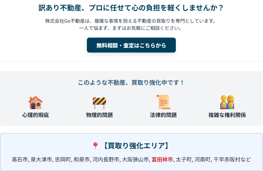 上記エリアで不動産の売却・買取りをご検討中の方は、ぜひ一度、株式会社Go不動産にご相談ください。