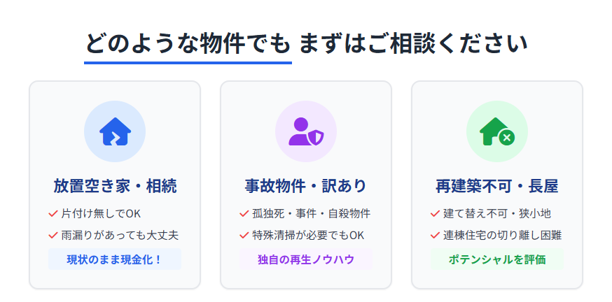 特に、一般的な仲介では買い手が見つかりにくい物件や、長年放置されてしまった空き家の取り扱いに強みを持っています。