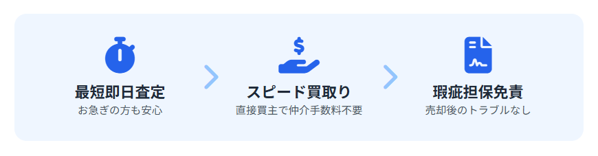 仲介売却のように、いつ売れるかわからない状態で買い手を探すのではなく、弊社が直接買主となりますので、売却後の瑕疵担保責任(契約不適合責任)も免責とさせていただくことが可能です。