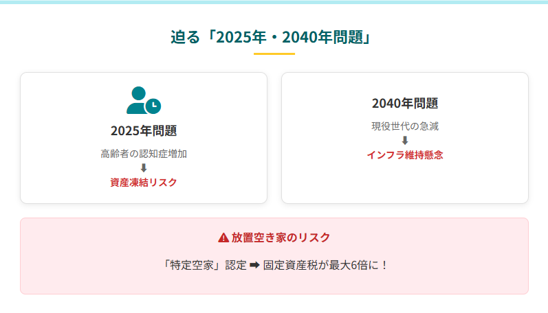 - 2025年問題: 団塊の世代(1947年~1949年生まれ)が75歳以上の後期高齢者となり、医療・介護の需要が急増する社会問題です。富田林市の計画書でも、2025年には高齢者の約5人に1人が認知症になると予測されていました。認知症により判断能力が低下すると、不動産の売却契約や管理が困難になる「資産凍結」のリスクが高まります。早めの対策が求められます。