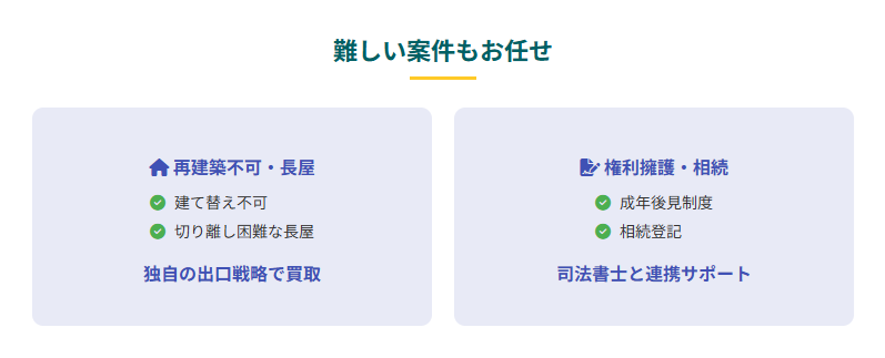権利関係が複雑な物件や、法律上の制限がある物件も、当社の得意分野です。