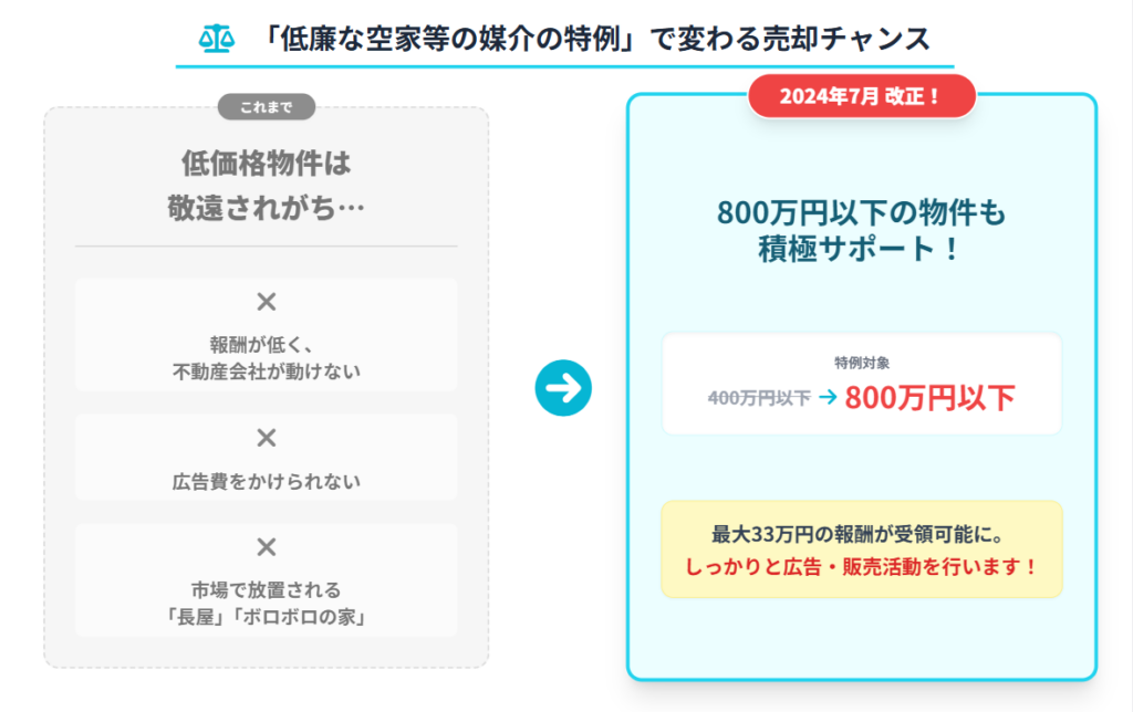 しかし、2024年7月1日に施行された「低廉な空家等の媒介の特例」の改正により、状況は大きく変わりました。